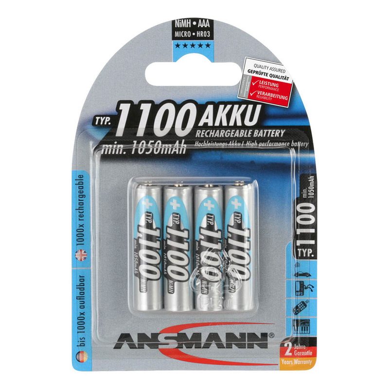 Marke ANSMANNHersteller / Verantwortliche Person ANSMANN AG, Industriestr. 10, 97959, Assamstadt, DE, service@ansmann.deVerpackungsart mit Menge 1 Pack = 4 St.Produktart AkkusBatterieart Micro AAABatterietyp Micro AAA, LR 3, LR 03, MN2400, HR3, HR03, FR3System Nickel-Metallhydrid (Ni-MH)Spannung 1,2 Vgeeignet für Taschenlampen, Spielzeug, Modellbau, Spielekonsolen, Digitalkameras, Blitzgeräte, medizinische Geräte etc.Höhe 44,5 mmDurchmesser 10,5 mmLadezyklen bis zu 1.000 mal wieder aufladbarkein Memory Effekt JaKapazität 1.050 mAhArtikelnummer 533 195
