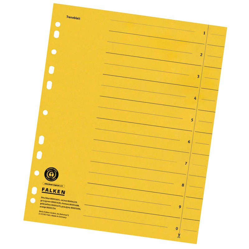 Diese Trennblätter von FALKEN in Gelb machen Ihre Ablage übersichtlich und farbcodiert. Die Zahlenaufdrucke sorgen für klare Gliederung.