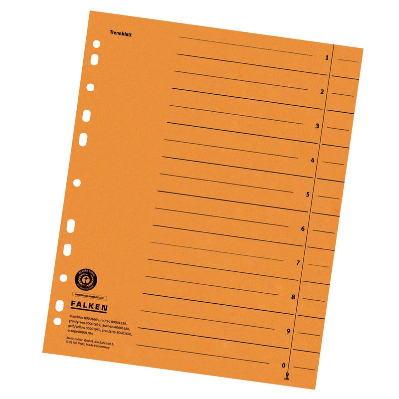 Die FALKEN Trennblätter in Orange setzen farbliche Akzente in Ihrer Ablage. Dank der Zahlen von 1–10 lassen sich Dokumente einfach strukturieren.