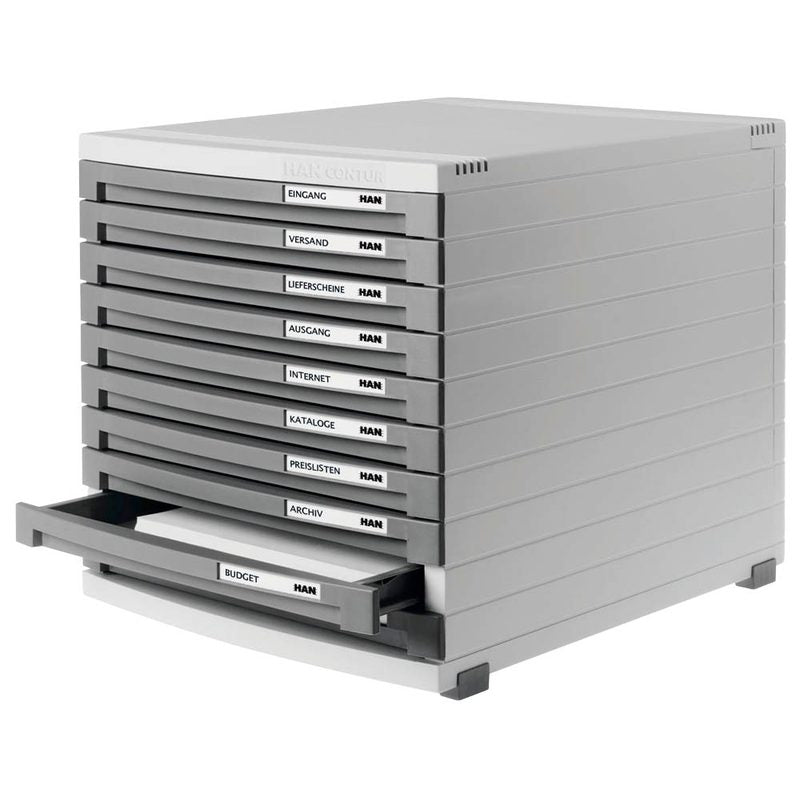 Die HAN Schubladenbox Contur in Dunkelgrau bietet eine stilvolle und funktionale Lösung zur Aufbewahrung von Dokumenten im DIN B4 Format. Mit ihren zehn Schubladen ermöglicht sie eine geordnete Aufbewahrung und einfachen Zugriff auf wichtige Unterlagen.Die robuste Bauweise und das ansprechende Design machen diese Schubladenbox zu einem idealen Begleiter für jeden Arbeitsplatz.