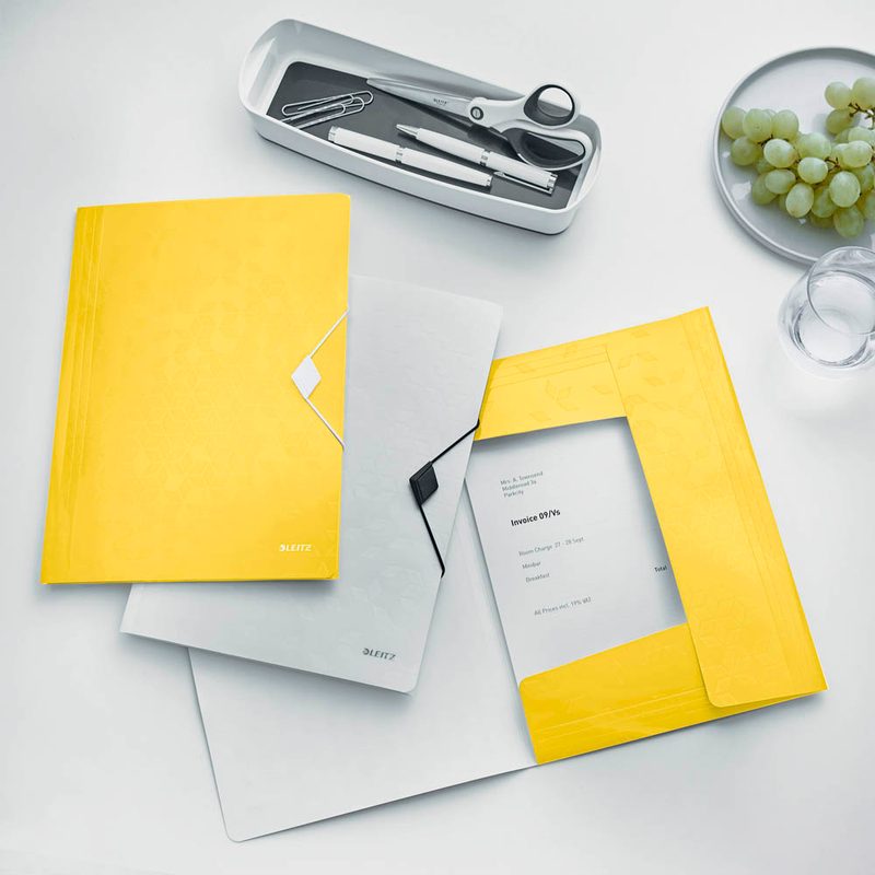 Sonnig, frisch und motivierend – der LEITZ Eckspanner WOW in Gelb ist perfekt, um deinem Büroalltag Farbe zu verleihen. Das leuchtende Gelb macht ihn zur idealen Wahl für Themen wie Rechnungen, To-do-Listen oder Projektmappen.
