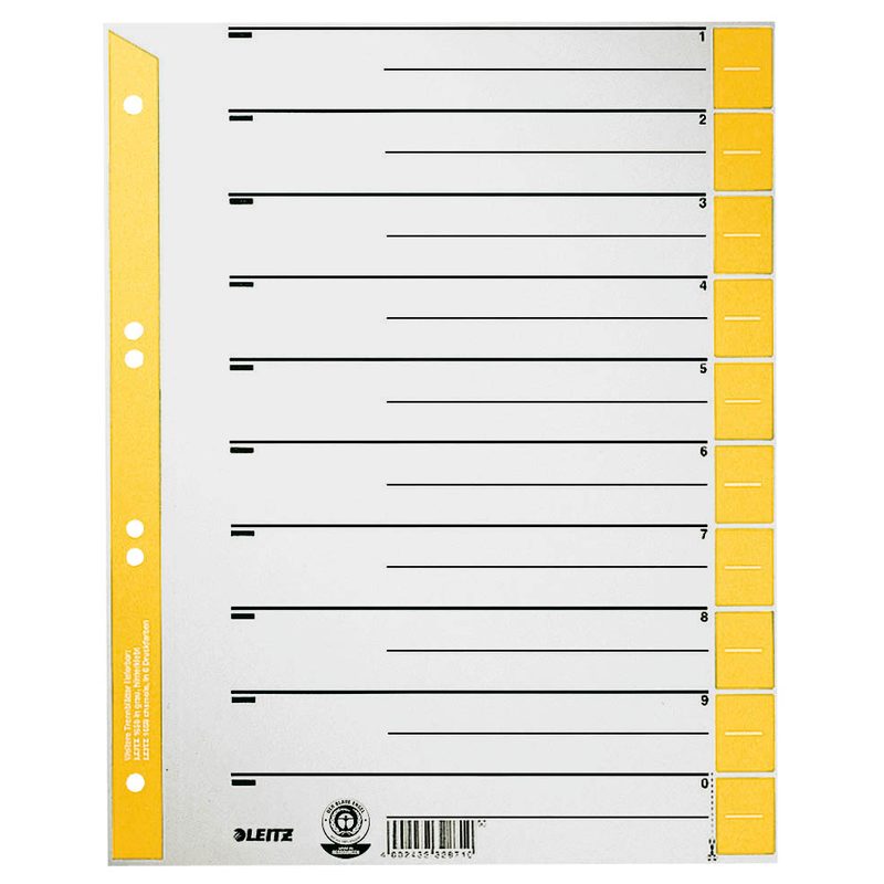 Die LEITZ Trennblätter 1652 in Gelb bieten dir schnelle und strukturierte Übersicht in Ordnern und Mappen. Mit klarer 1–0 Beschriftung und 25 Stück pro Packung perfekt zur Ablage nach Kategorien.