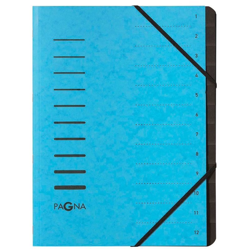 Perfekt für alle, die viele Dokumente organisieren: Die PAGNA Ordnungsmappe mit 12 Fächern in Blau schafft Ordnung bei hoher Papierflut. Jede Kategorie oder jeder Monat erhält ein eigenes Fach.