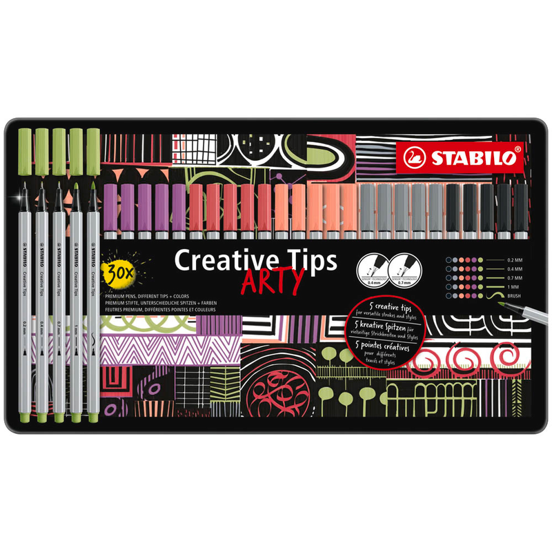 Marke STABILOHersteller / Verantwortliche Person STABILO International GmbH, Schwanweg 1, 90562, Heroldsberg, DE, info@stabilo.comProdukttypenbezeichnung ARTY PASTELVerpackungsart mit Menge 1 Pack = 30 St.Produktart FilzstifteDetailschreibfarbe 5x pistazie, pflaume, rostrot, apricot, mittelgrau, schwarzFarbe Gehäuse grauMaterial Gehäuse KunststoffAusführung der Griffzone SechskantSpitze Rundspitzeoffen lagerfähig NeinVerpackung Metall-EtuiStrichstärke 0,2 + 0,4 + 0,7 + 1,0 + Brush mmArtikelnummer 363 687