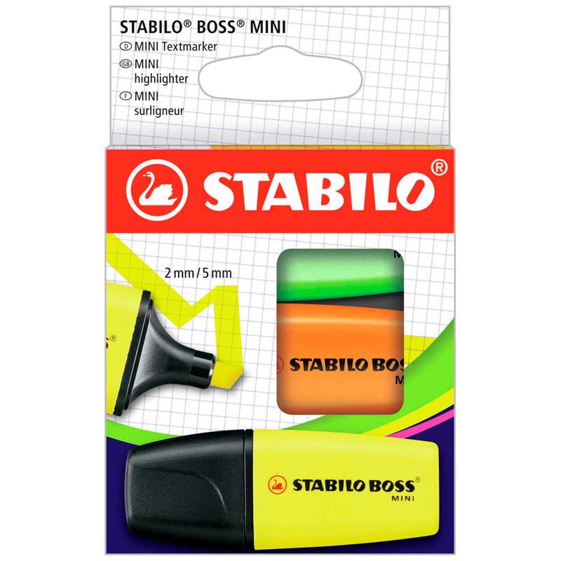 Marke STABILOHersteller / Verantwortliche Person STABILO International GmbH, Schwanweg 1, 90562, Heroldsberg, DE, info@stabilo.comProdukttypenbezeichnung BOSS MINIVerpackungsart mit Menge 1 Pack = 3 St.Produktart TextmarkerDetailschreibfarbe gelb, orange, grünSpitze KeilspitzeAusführung der Griffzone ergonomischMaterial Gehäuse KunststoffFarbe Gehäuse gelb, orange, grünoffen lagerfähig bis zu 4 StundenStrichstärke 2,0 - 5,0 mmArtikelnummer 416 857