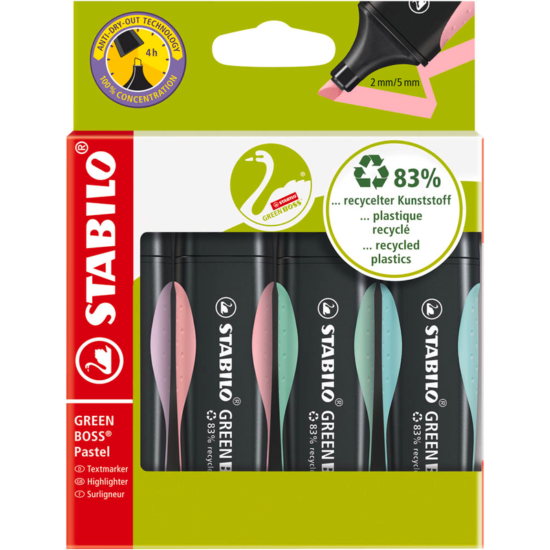 Marke STABILOHersteller / Verantwortliche Person STABILO International GmbH, Schwanweg 1, 90562, Heroldsberg, DE, info@stabilo.comProdukttypenbezeichnung GREEN BOSS PastellVerpackungsart mit Menge 1 Pack = 4 St.Made in GermanyProduktart TextmarkerDetailschreibfarbe zartes Türkis, Hauch von Minzgrün, rosiges Rouge, Schimmer von LilaSpitze KeilspitzeAusführung der Griffzone gummiertMaterial Gehäuse KunststoffFarbe Gehäuse schwarzoffen lagerfähig bis zu 4 StundenStrichstärke 2,0 - 5,0 mmArtikelnummer 370 043