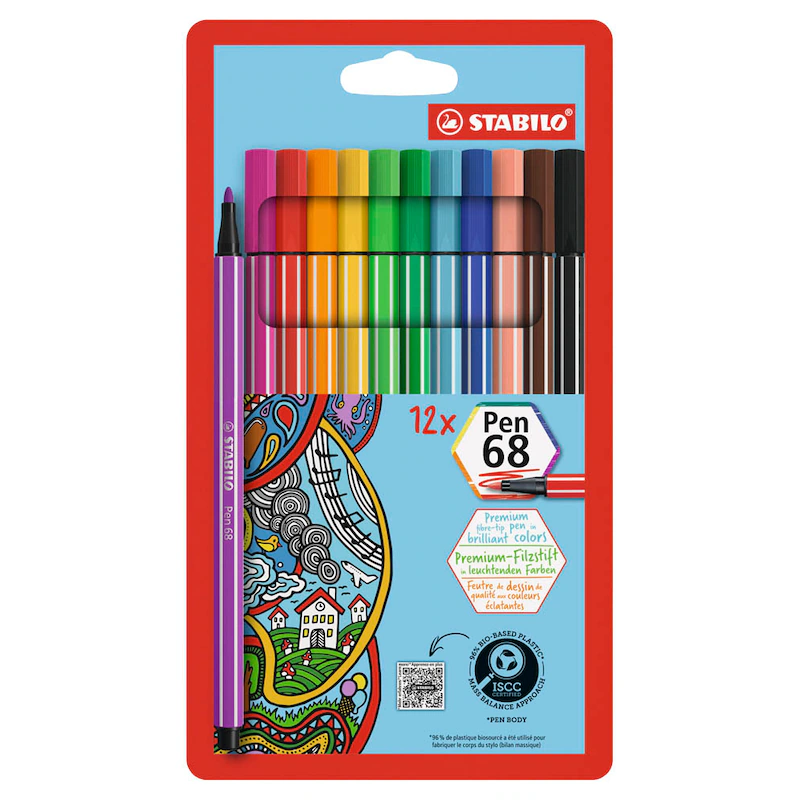 Marke STABILOHersteller / Verantwortliche Person STABILO International GmbH, Schwanweg 1, 90562, Heroldsberg, DE, info@stabilo.comProdukttypenbezeichnung Pen 68Verpackungsart mit Menge 1 Pack = 12 St.Lieferanten-Art.-Nr. 6812-7Made in GermanyProduktart FilzstifteDetailschreibfarbe 12 verschiedene FarbenFarbe Gehäuse 12 verschiedene FarbenMaterial Gehäuse KunststoffAusführung der Griffzone SechskantSpitze Rundspitzeoffen lagerfähig NeinVerpackung Karton-EtuiStrichstärke 1,0 mmSicherheitshinweis ACHTUNG! Nicht geeignet für Kinder unter 36 Monaten, wegen verschluckbarer Kleinteile. ErstickungsgefahrArtikelnummer 502 862