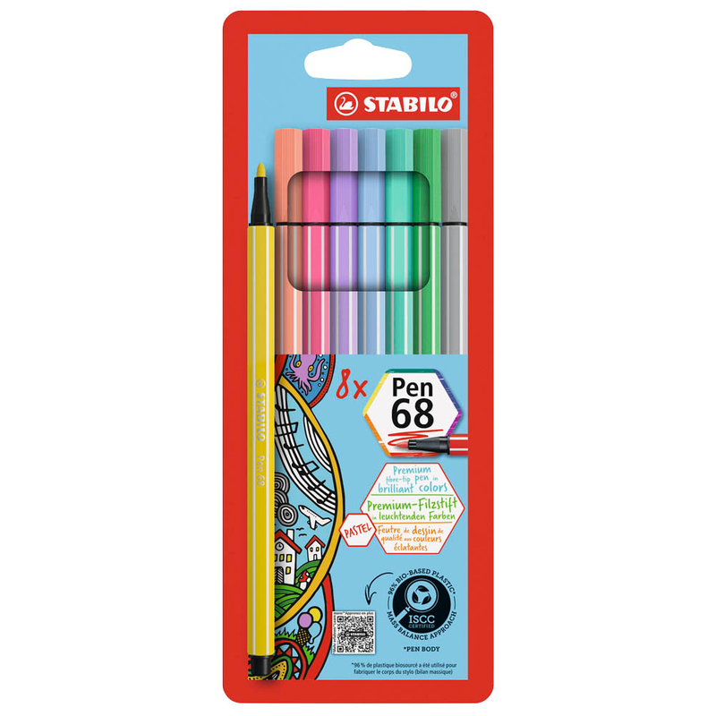 Marke STABILOHersteller / Verantwortliche Person STABILO International GmbH, Schwanweg 1, 90562, Heroldsberg, DE, info@stabilo.comProdukttypenbezeichnung pen 68Verpackungsart mit Menge 1 Pack = 8 St.Lieferanten-Art.-Nr. 68/8-01Made in GermanyProduktart FilzstifteDetailschreibfarbe zitronengelb, hellrosa, rosa, flieder, kobaltblau hell, eisgrün, smaragdgrün, hellgrauFarbe Gehäuse zitronengelb, hellrosa, rosa, flieder, kobaltblau hell, eisgrün, smaragdgrün, hellgrauMaterial Gehäuse KunststoffAusführung der Griffzone SechskantSpitze Rundspitzeoffen lagerfähig NeinVerpackung Kunststoff-EtuiStrichstärke 1,0 mmBesonderheiten farbintensiv - für kräftige Linien und deckende Flächen. Hohe Brillanz und Leuchtkraft. Bis zu 24 Stunden offenlagerfähig. Die robuste M-Spitze sorgt für gleichmäßige Farbabgabe. Kappe am Stiftende aufsteckbar.Sicherheitshinweis ACHTUNG! Nicht geeignet für Kinder unter 36 Monaten, wegen verschluckbarer Kleinteile. ErstickungsgefahrArtikelnummer 446 512