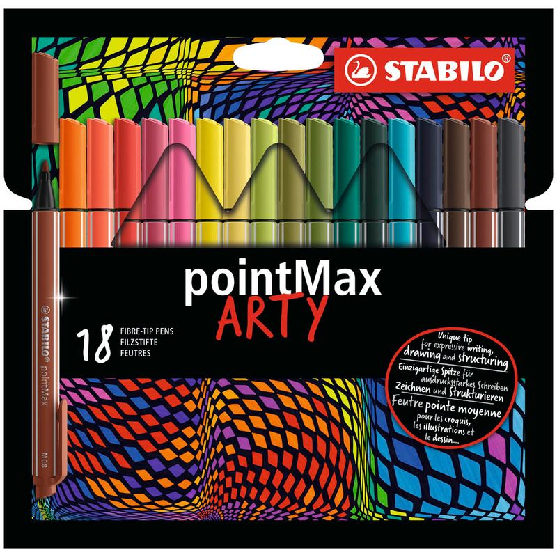 Marke STABILOHersteller / Verantwortliche Person STABILO International GmbH, Schwanweg 1, 90562, Heroldsberg, DE, info@stabilo.comProdukttypenbezeichnung pointMax ARTYVerpackungsart mit Menge 1 Pack = 18 St.Made in GermanyProduktart FilzstifteDetailschreibfarbe 18 verschiedene FarbenFarbe Gehäuse 18 verschiedene FarbenMaterial Gehäuse KunststoffAusführung der Griffzone SechskantSpitze Rundspitzeoffen lagerfähig bis zu einigen StundenVerpackung ohne EtuiStrichstärke 0,8Material Clip KunststoffArtikelnummer 967 007