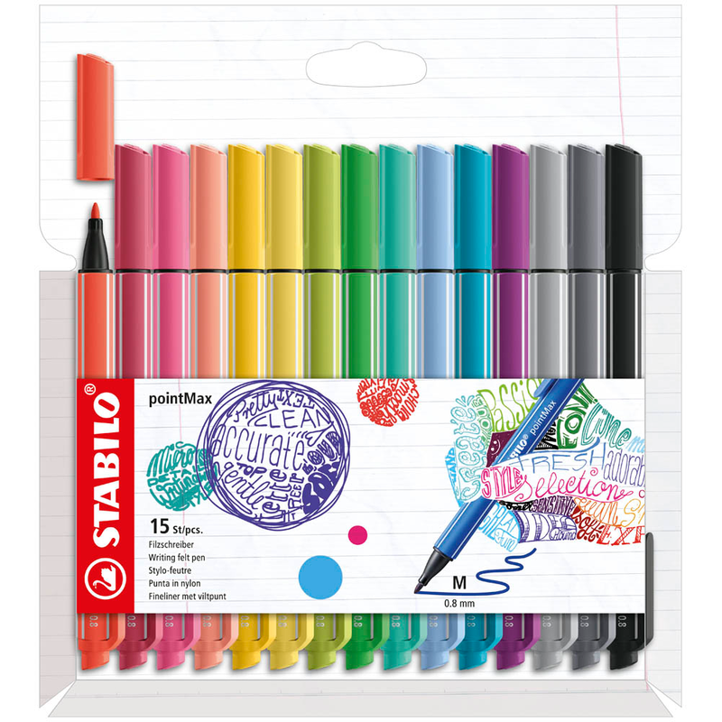 Marke STABILOHersteller / Verantwortliche Person STABILO International GmbH, Schwanweg 1, 90562, Heroldsberg, DE, info@stabilo.comProdukttypenbezeichnung pointMaxVerpackungsart mit Menge 1 Pack = 15 St.Made in GermanyProduktart FilzstifteDetailschreibfarbe 15 verschiedene FarbenFarbe Gehäuse 15 St. farbsortiertMaterial Gehäuse KunststoffAusführung der Griffzone SechskantSpitze Rundspitzeoffen lagerfähig bis zu einigen StundenVerpackung ohne EtuiStrichstärke 0,8Material Clip KunststoffArtikelnummer 700 937
