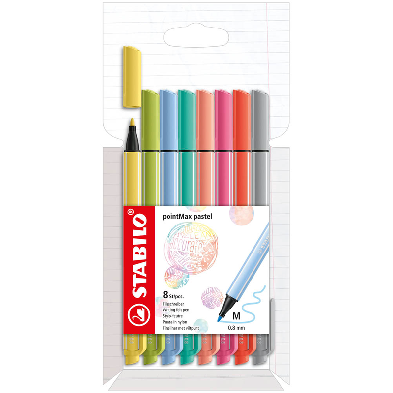 Marke STABILOHersteller / Verantwortliche Person STABILO International GmbH, Schwanweg 1, 90562, Heroldsberg, DE, info@stabilo.comProdukttypenbezeichnung pointMax pastelVerpackungsart mit Menge 1 Pack = 8 St.Made in GermanyProduktart FilzstifteDetailschreibfarbe pudriges gelb, limettengrün, eisblau, eisgrün, apricot, rosa, korallrot und hellgrauFarbe Gehäuse pudriges gelb, limettengrün, eisblau, eisgrün, apricot, rosa, korallrot und hellgrauMaterial Gehäuse KunststoffAusführung der Griffzone SechskantSpitze Rundspitzeoffen lagerfähig bis zu einigen StundenVerpackung ohne EtuiStrichstärke 0,8Material Clip KunststoffArtikelnummer 700 924