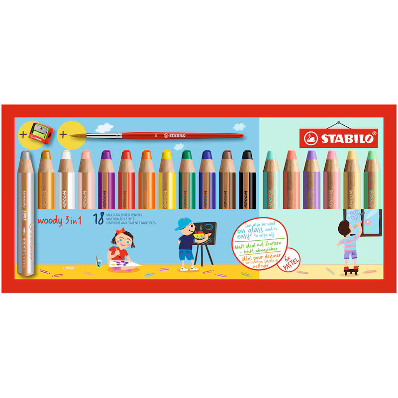 Marke STABILOHersteller / Verantwortliche Person STABILO International GmbH, Schwanweg 1, 90562, Heroldsberg, DE, info@stabilo.comProdukttypenbezeichnung woody 3 in 1 + PASTELVerpackungsart mit Menge 1 Pack = 18 St.Produktart BuntstifteAusführung des Stiftes JumboInhalt 18 StifteVerpackung Karton-EtuiSchaftform rundDetailschreibfarbe STABILOrot, apricot, braun, dunkelgrün, erika, gelb, gold, orange, pastellblau, pastellgelb, pastellgrün, pastelllila, pastellpink, pastellrot, schwarz, silber, ultramarinblau, weißQualität der Mine hohe Minenstabilität und BruchfestigkeitLieferung inkl. Spitzer und PinselBesonderheiten Multitalentstift: Buntstift, Wassermalfarbe und Wachsmalstift in einem.Sicherheitshinweis ACHTUNG! Nicht geeignet für Kinder unter 36 Monaten, wegen verschluckbarer Kleinteile. ErstickungsgefahrArtikelnummer 700 902