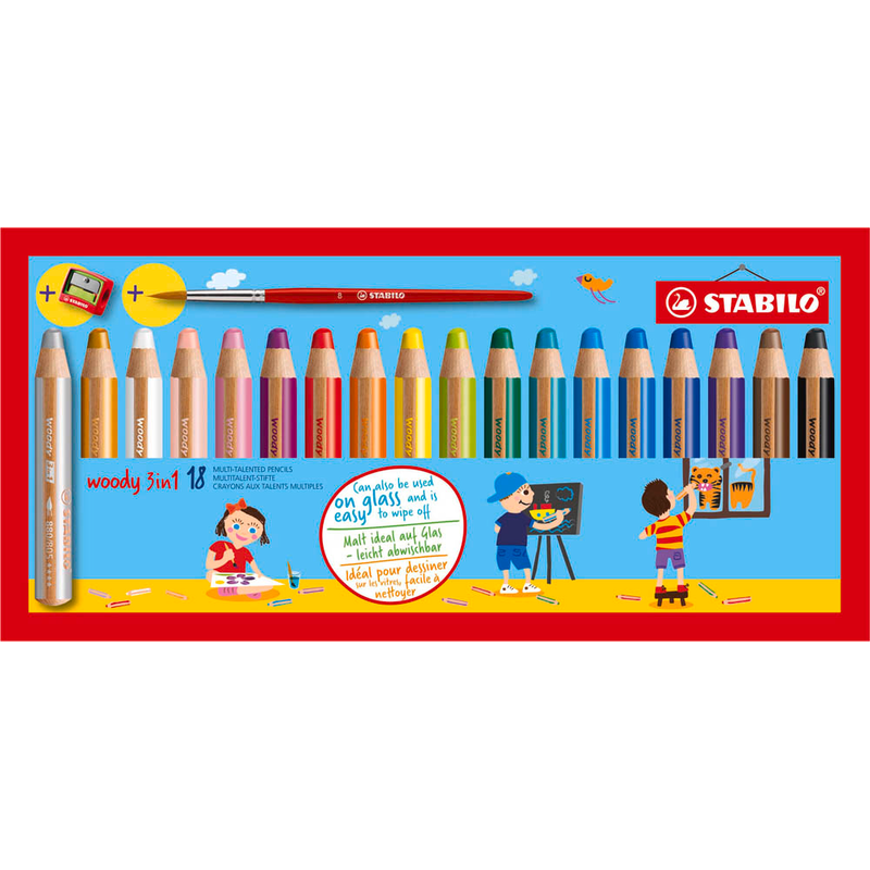Marke STABILOHersteller / Verantwortliche Person STABILO International GmbH, Schwanweg 1, 90562, Heroldsberg, DE, info@stabilo.comProdukttypenbezeichnung woody 3 inVerpackungsart mit Menge 1 Pack = 18 St.Produktart BuntstifteAusführung des Stiftes JumboInhalt 18 StifteVerpackung Karton-EtuiSchaftform rundDetailschreibfarbe weiß, gelb, orange, rot, pink, apricot, erika, violett, ultramarinblau, mittelblau, cyanblau, türkis, dunkelgrün, hellgrün, braun, schwarz, silber, goldQualität der Mine hohe Minenstabilität und Bruchfestigkeitverwendbar für KleinkinderLieferung inkl. Spitzer und PinselBesonderheiten Multitalentstift: Buntstift, Wassermalfarbe und Wachsmalstift in einem.Sicherheitshinweis ACHTUNG! Nicht geeignet für Kinder unter 36 Monaten, wegen verschluckbarer Kleinteile. ErstickungsgefahrArtikelnummer 816 203