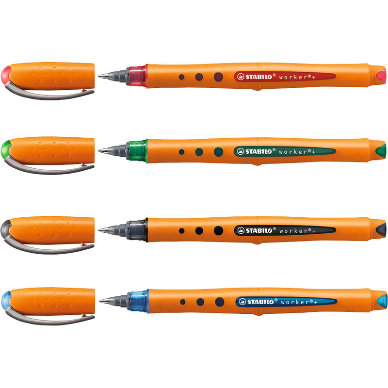 Marke STABILOHersteller / Verantwortliche Person STABILO International GmbH, Schwanweg 1, 90562, Heroldsberg, DE, info@stabilo.comProdukttypenbezeichnung worker®+Verpackungsart mit Menge 1 Pack = 4 St.Made in GermanyProduktart TintenrollerDetailschreibfarbe schwarz, blau, rot, grünAusführung der Griffzone gummiertFarbe Gehäuse orangeMaterial Gehäuse gummiertSpitze Neusilber-Spitzegeeignet für Rechts- und LinkshänderMaterial Clip MetallBesonderheiten RollstoppKugel-Ø der Schreibspitze 0,8 mmArtikelnummer 905 794